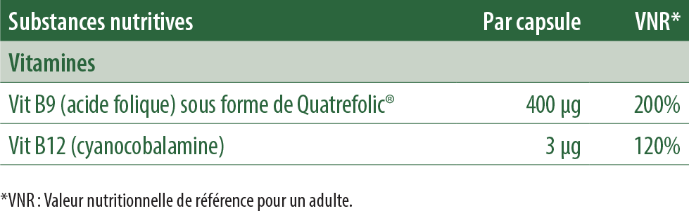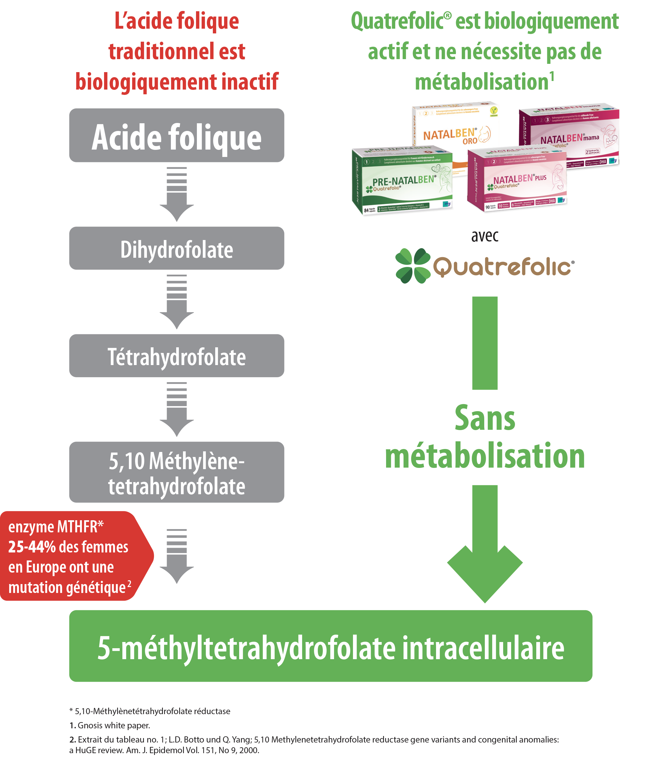 Tous les produits de la famille NATALBEN® contiennent du Quatrefolic® : une forme innovante de folate qui ne nécessite pas de métabolisation et peut donc être utilisé immédiatement par les cellules.