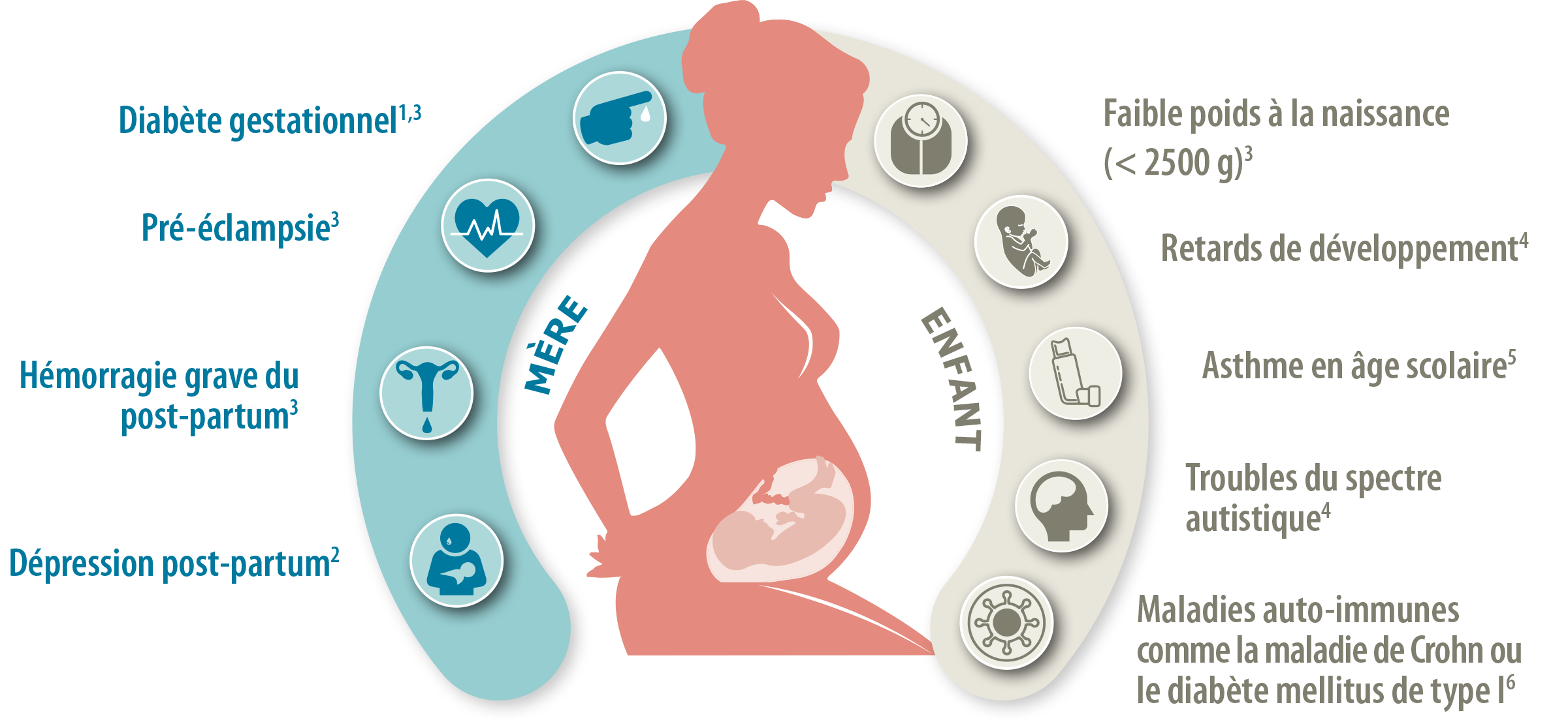 *La réduction du risque relatif est calculée en soustrayant le risque relatif selon la formule suivante : 1-RRx100 (par exemple, pour le calcul de la réduction du RR pour un décès périnatal : (1-0,75)x100 = 25%).