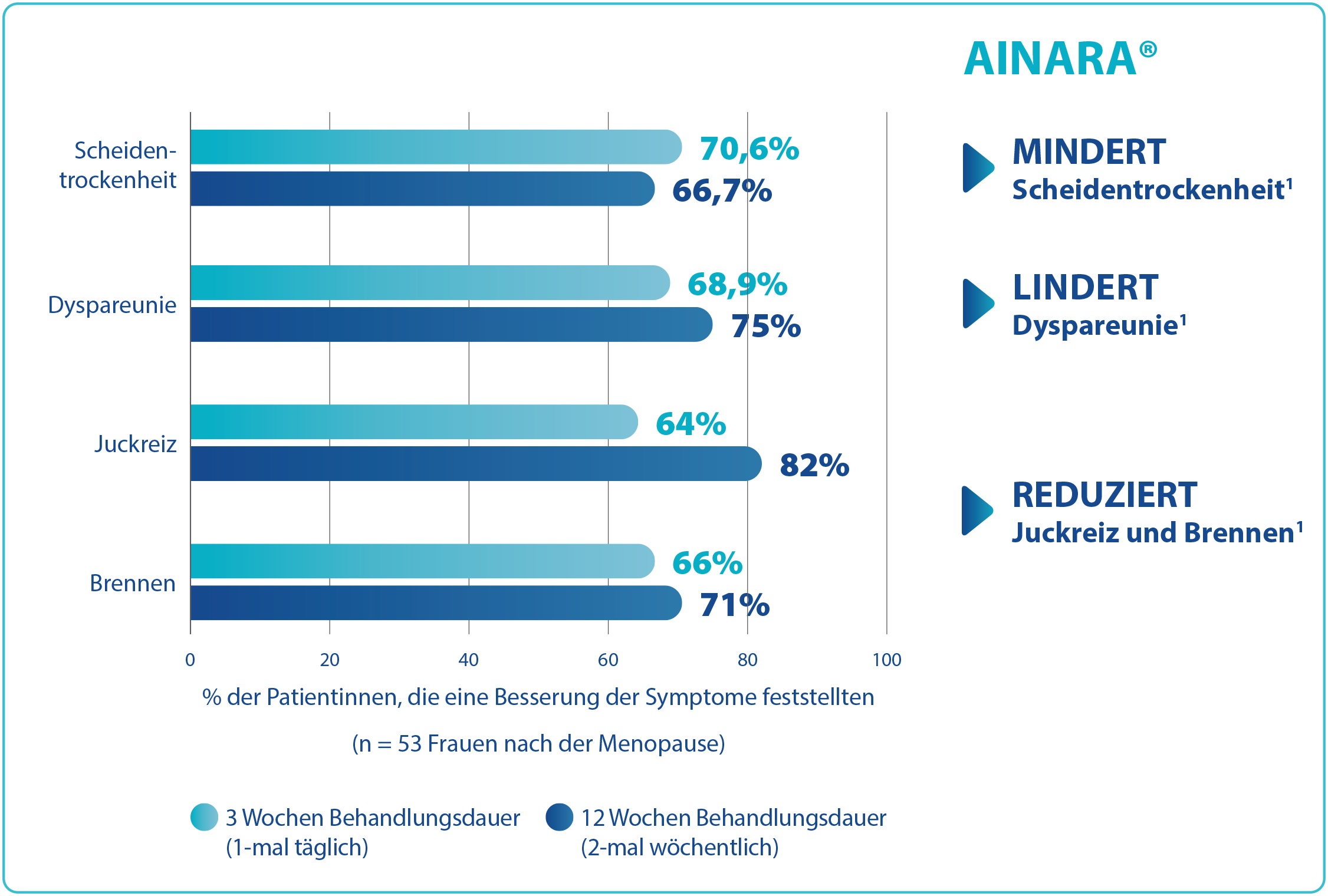 AINARA®, ein HORMONFREIES mukoadhäsives (an der Scheidenschleimhaut haftendes) Vaginal-Gel zur Befeuchtung, lindert die Symptome der Scheidentrockenheit sowie Beschwerden im Intimbereich und verbessert die Lebensqualität: